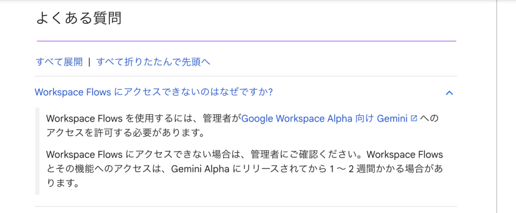 先ほどの上記ページの、「Google Workspace Alpha向け Gemini」というリンク部分を踏むと、下の画像のページに飛びます。