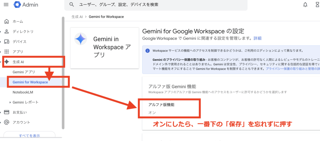 Google Workspace管理者ページ(下図)に飛んだら、赤枠で囲ってある通りに、「生成AI」→「Gemini for Workspace」→「アルファ機能」に行き、設定をオンにします。